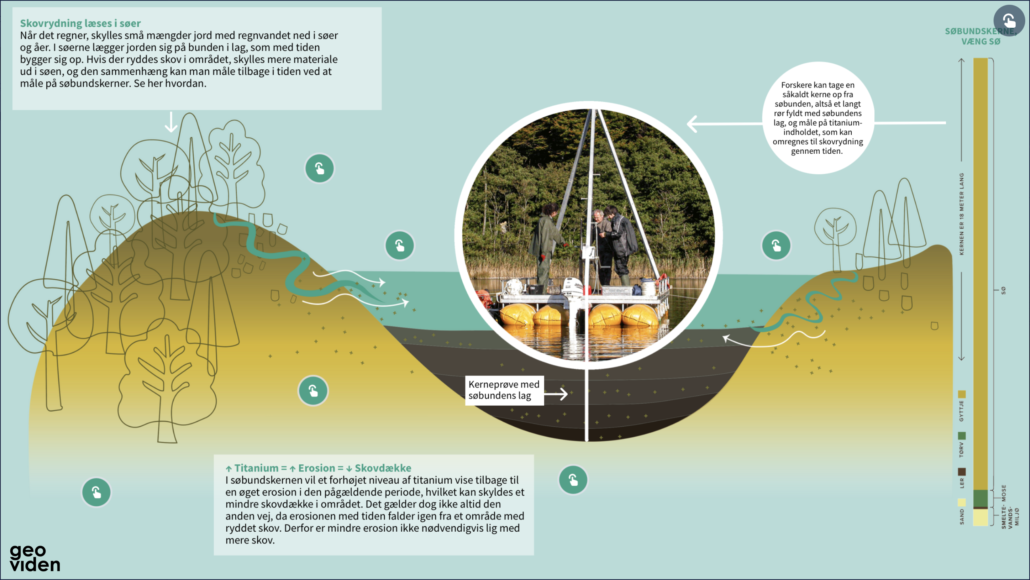 ”Grundstoffet titanium findes i små mængder i alle danske jorde, men ikke i søer. De koncentrationer, der i dag kan måles nedefter i søbunden, må derfor være tilført med erosionsmateriet. Desuden indgår titanium ikke i nogen naturlige kredsløbsprocesser i søerne, så den tilførte mængde bliver ved med at være der og kan dermed bruges til at estimere graden af erosion gennem tiden,” fortæller forskeren. (Se figur herunder).