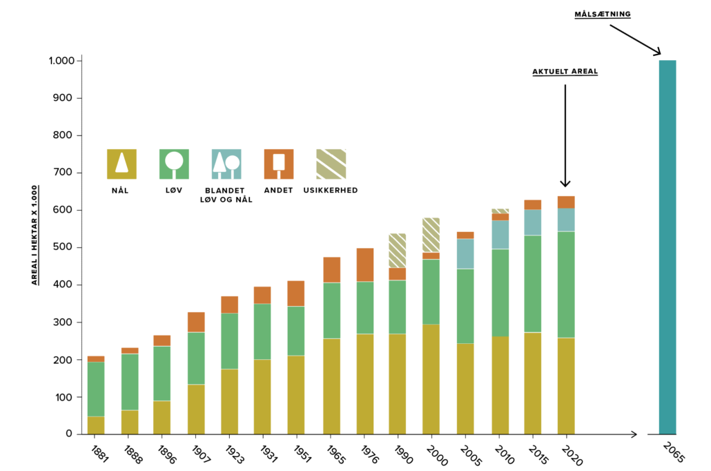 Udvikling og sammensætning i Danmarks skovareal. I starten plantedes især nåletræer som rødgran, men i de seneste årtier er andelen af løvskov steget væsentligt. Skraveret areal vi-ser nogle år med uoverensstemmelser mellem optællinger og satellitbilleder. ‘Andet’ er veje, stier, åbne pladser og andre menneskeskabte såkaldte ’hjælpearealer’ i skovene. Længst til højre ses det politiske mål for skovareal i 2065, som er på 1 mio. hektar. Graf: Lykke Sandal, Geoviden baseret på Nord-Larsen, T., Johannsen, V.K., Riis-Nielsen, T., Thomsen, I.M., & Jørgensen, B.B. (2021): ‘Skovstatistik 2020’. Institut for Geovidenskab og Naturforvaltning, Københavns Universitet