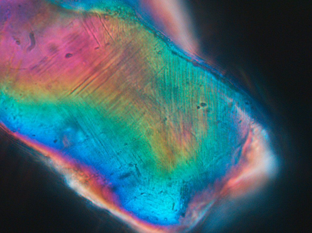 ”Vi fik idéen om at tage prøver langs gletsjerens front, hvor vi forventer, at gletsjeren bærer sand med ud inde fra krateret. Det er jo meget heldigt for os, når krateret er under isen,” fortæller Nicolaj Krog Larsen. Og konklusionen på analyserne af kvartskornene var klar: Som du kan se på det flotte billede nederst i den grå boks herunder, hvor det ellers gennemsigtige kvarts er gennemlyst af polariseret lys, er nedslagsfingeraftrykket lige dér i mineralkornet i form af paralleller linjer: choklameller.