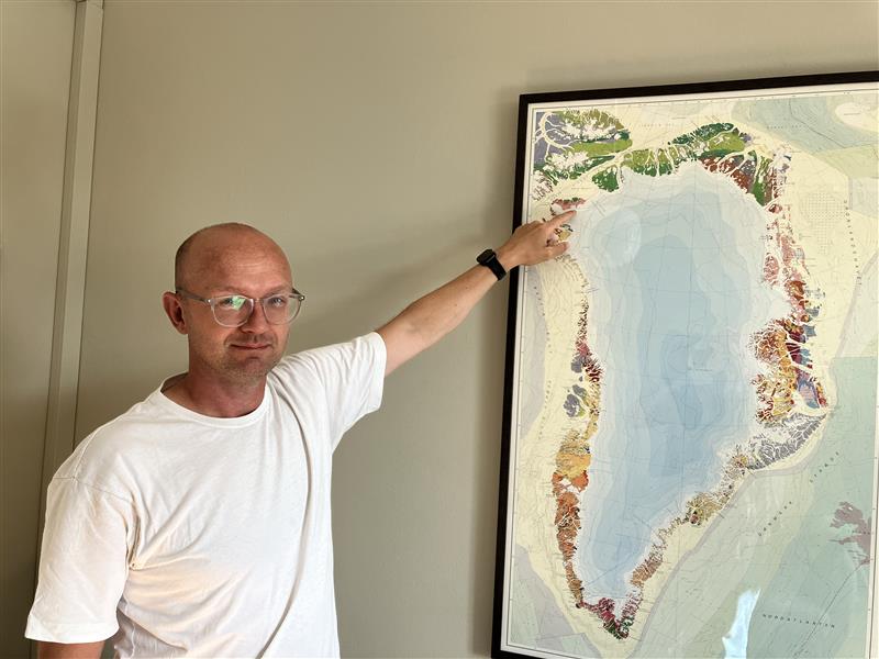 Nicolaj Krog Larsen er professor ved Globe Institute ved Københavns Universitet. Her peger Nicolaj på et kort over Grønland der, hvor Hiawatha-krateret er.