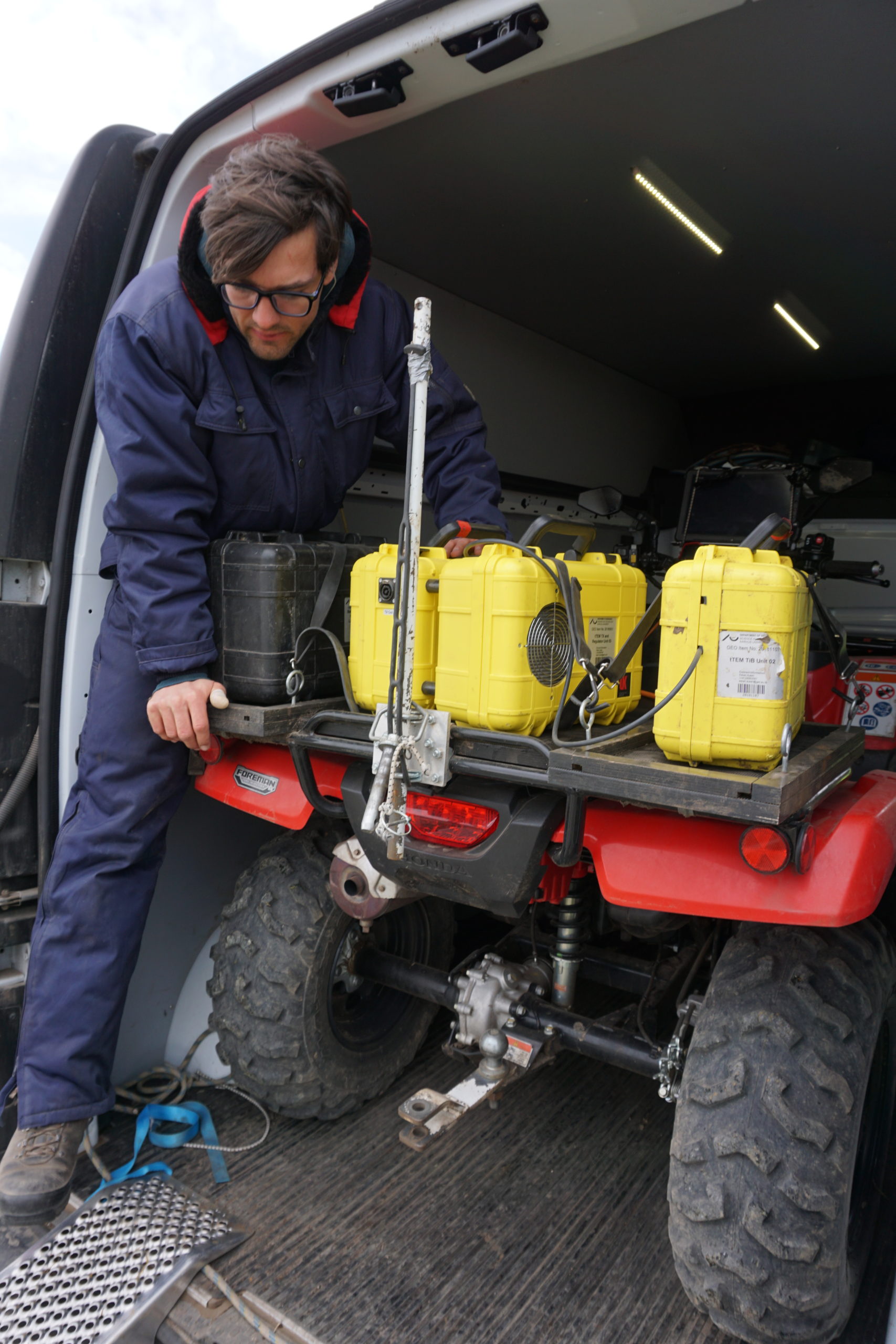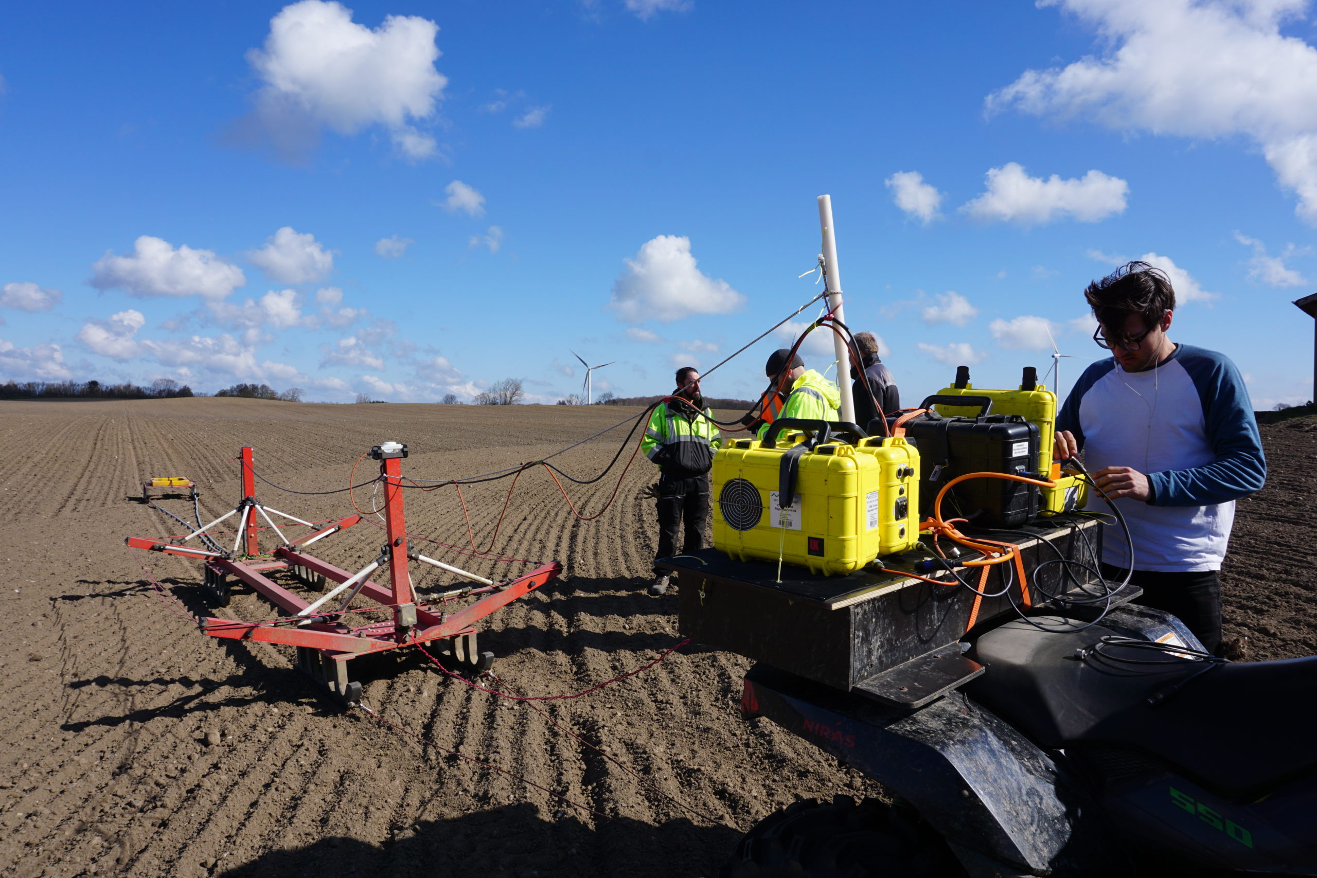 Hele anordningen, som Rune Kraghede zigzagger af sted med hen over markerne, ligner ikke den gennemsnitlige maskine, der færdes på en mark. På ATV’ens rat sidder en computerskærm, og på bagsædet sidder tre gule batterikasser fastmonteret med strips og remme. Ledningerne fra dem ledes over til en stor sort kælk med noget, der ligner en hightech tørresnor, og bagerst, for enden af to lange kabler, sidder der en mindre kælk med en fastspændt gul firkant. Tilsammen udgør kortegen en nyudviklet teknik ved navn tTEM, der står for ’towed Transient Electro Magnetic’.