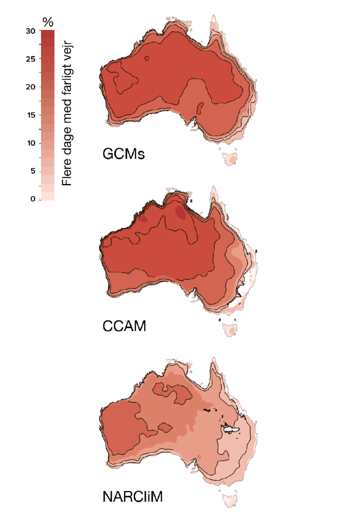 Der blev taget udgangspunkt i tre forskellige typer klimamodeller under det klimascenario, hvor CO2-udledningen bliver ved med at stige, hvilket er realiteten lige nu. Her viste alle beregninger, at der i store områder af Australien ville være markant flere dage med brandfarligt vejr i årene 2060-2079, end der var i årene 1990-2009 (se herunder).