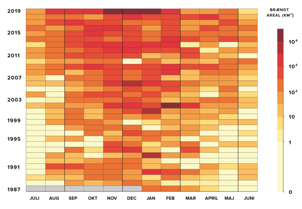 Der havde allerede været brande op til advarslen, men der kom – ganske rigtigt – mange flere, som over de næste par måneder åd sig igennem mere end 240.000 km2 af den australske sydøst-kyst. Altså mere end fem gange Danmarks areal.