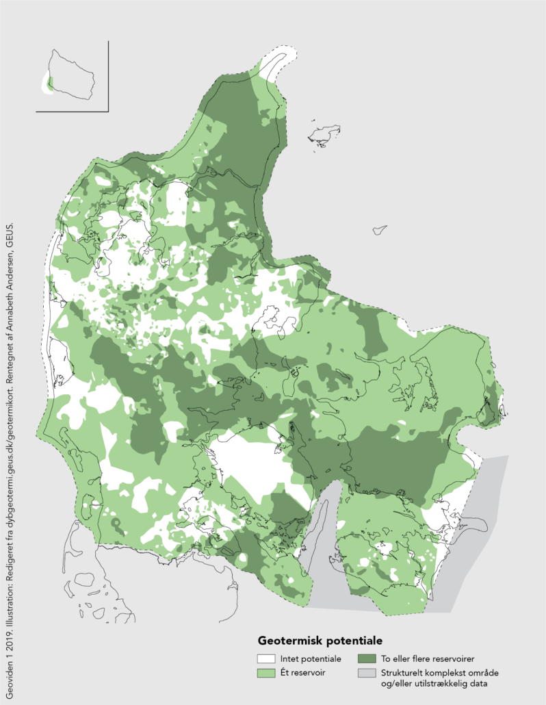 (Se kortet herunder for områder med varierende potentiale for geotermi i Danmark)
