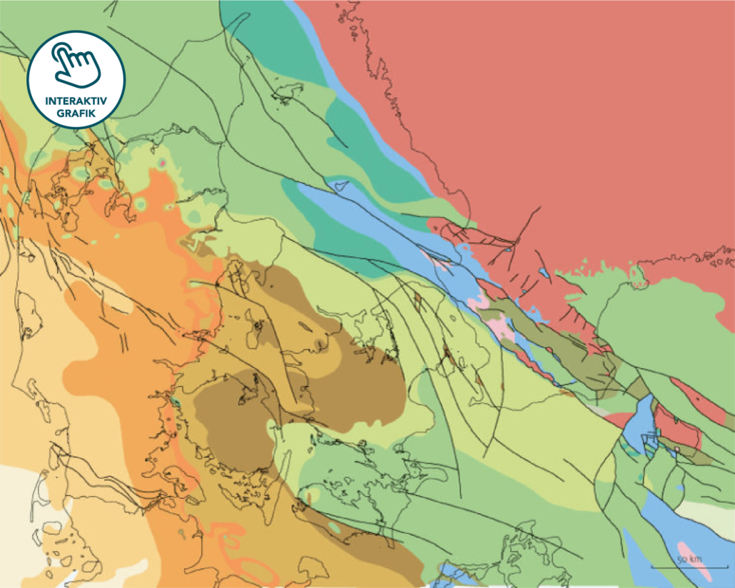 Nogle steder kan man allerede her se lagene fra dinosaurtiden (Trias, Jura og Kridt), andre steder ligger de dybere nede.