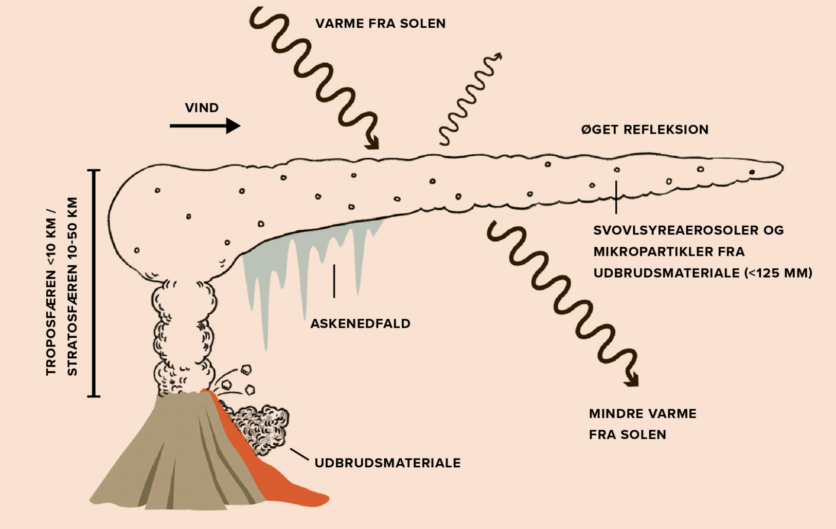 - Eksplosionens kraft: Hvis udbruddet er kraftigt nok, kan partiklerne nå helt ud i stratosfæren, som ligger 10-50 kilometer over os. I stratosfæren er der normalt ingen skyer eller regn, så partiklerne er længe om at blive vasket ud. Derfor kan de blive hængende deroppe i lang tid og nå vidt omkring.