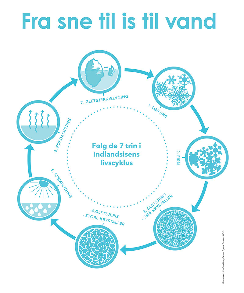 Dannelsen af ny is beskrives herunder og kobles sammen med resten af vandkredsløbet fra atmosfæren til havet og så videre. Når isen til sidst smelter enten direkte fra ismassen eller som et afbrækket isbjerg, vender vandet tilbage i vandkredsløbet og kan nu igen blive til nedbør, som igen kan blive lavet til ny is.