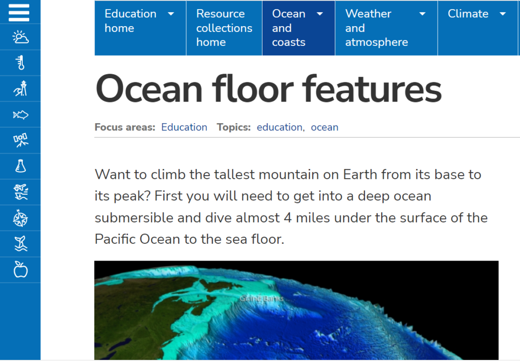 Det amerikanske National Oceanic and Atmospheric Administration (NOAA) bedriver alskens forskning i hav og atmosfære og sammenhængen mellem dem. De har bl.a. en virkelig god ‘education’-side, hvor man kan finde en hel masse artikler, billeder, animationer, databaser osv. over havstrømme, undersøiske vulkaner, forsuring af havene, havbundskortlægning m.m.