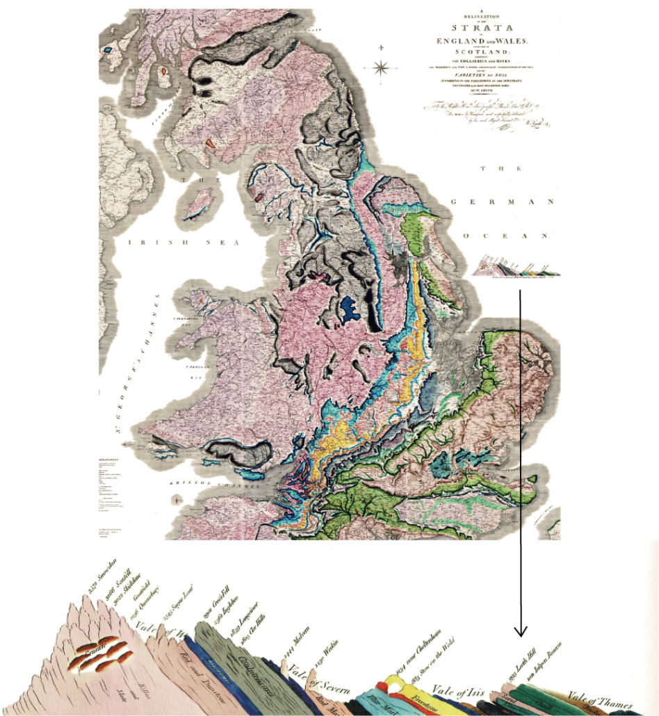 Ganske kort efter blev der udgivet et kort, som geologer i dag nærmest sover med under hovedpuden. Nemlig kortet over Storbritanniens geologi fra 1815 udarbejdet af William Smith, der i dag er kendt som ‘geologiens far’. Kortet (t.v.) byggede på helt nye principper, som stadig bruges i dag, nemlig at Jorden er inddelt i lag, der er dannet i forskellige tider. På den måde viser de selve Jordens udvikling i tid, hvilket også blev understreget af lagenes indhold af fossiler, der også viste sig at ændre sig på tværs af forskellige lag – nogle arter uddøde, mens andre udviklede sig til nye. Hvis den samme bjergart indeholdt samme fossiltyper på to forskellige kontinenter, så var de nok cirka lige gamle, konkluderede han. Den idé gjorde, at man pludselig kunne få geologien over hele Jorden til at hænge sammen og lave en slags ‘dagbog’ over både Jordens og livets udvikling – noget, geologer arbejder videre på den dag i dag.