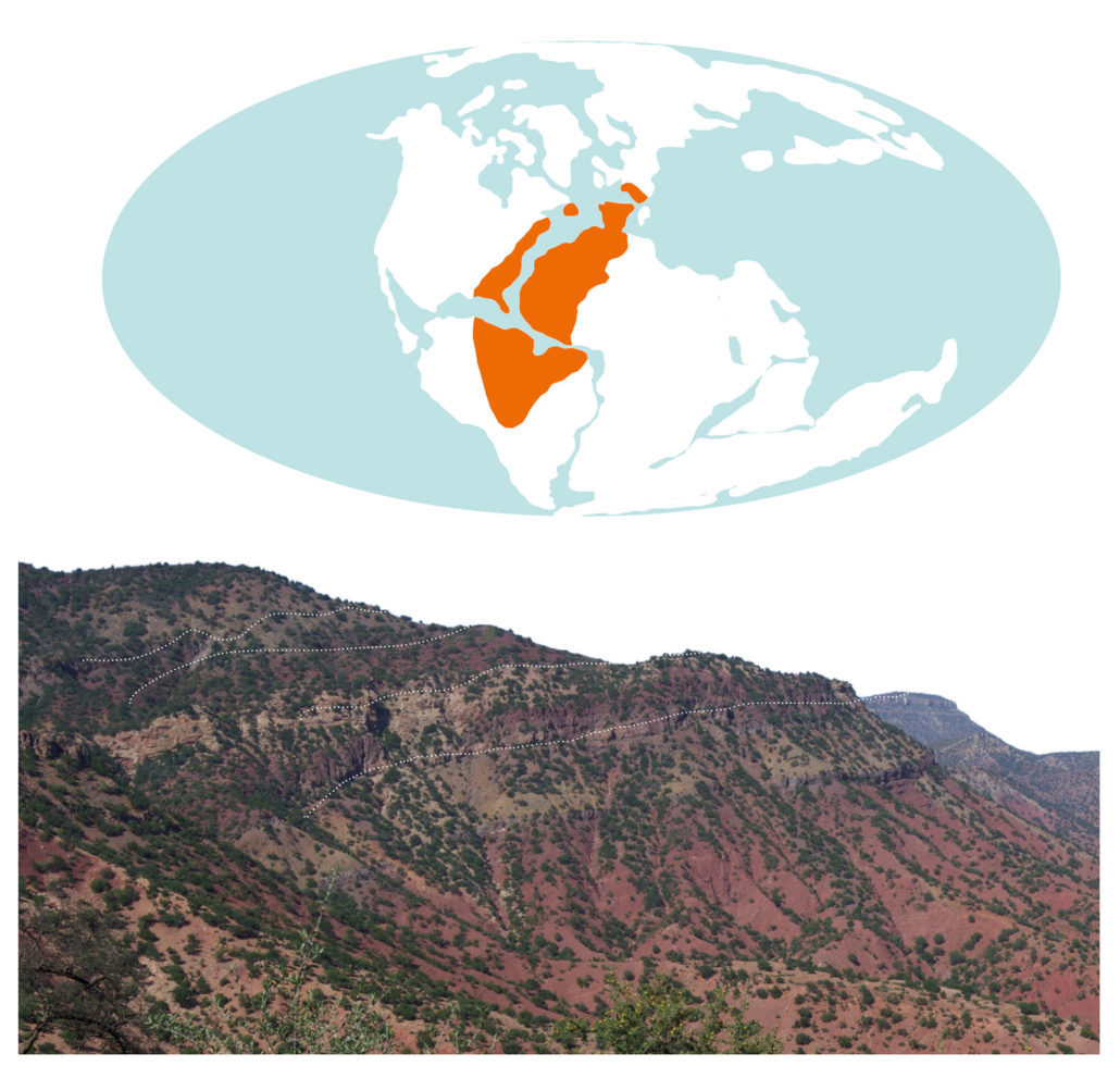 I Trias sad al landjorden sammen i et superkontinent kaldet Pangæa. I slutningen af Trias begyndte landmasserne dog at splitte op og drive fra hinanden, og det skabte et enormt vulkansk aktivt område langs brudfladen, (orange område). På omkring en halv mio. år udspyede de mange vulkaner i det aktive område så meget lava, at det ville kunne dække hele nutidens Europa fra Uralbjergene til Atlanterhavet under et 230 m tykt lag. Lagene af størknet lava kan stadig ses flere steder, blandt andet i Atlasbjergene i Marokko (ses her t.v. som lyse striber imellem de rødlige lag, afsat i tre perioder med særlig voldsom vulkansk aktivitet). (Illustration: Lykke Sandal og GEUS)