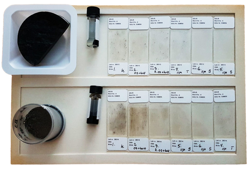 Sporeprøver på glas. Selve prøverne ser sådan her ud: små aflange glasplader, der er limet sammen med en indtørret dråbe af prøvevæske med sporer og andre organiske rester i midten. Ved siden af ses et stykke af ophavet til prøverne, som er en borekerne fra Stenlille på Midstjælland. Stenen knuses til pulver, behandles med syrer osv., før den ender som en prøve på glas. (Foto: Sofie Lindström)