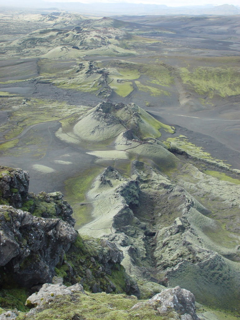 Også i nyere tid har store vulkanudbrud skabt problemer for dyr og planter. Et af de værste udbrud i nyere historisk tid var i 1783, da den islandske spaltevulkan Laki (billedet) gik i udbrud. Den 25 km lange vulkansprække var i konstant udbrud i otte måneder og dækkede nærområdet med 15 km3 lava og aske samt sendte over 100 millioner ton svovldioxid ud i atmosfæren. Det skabte udbredt syreregn og forgiftning af luft, jord og vandløb. En fjerdedel af Islands befolkning døde af sult eller forgiftning den vinter (ca. 10.000 mennesker), og i Nordeuropa var der forhøjet dødelighed og fejlslagen høst i flere år efter. (Foto: Sune S. Selbekk, Store norske leksikon)