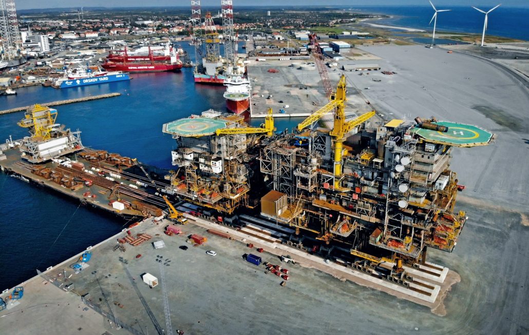Den gamle hovedplatform blev sejlet i land i et stykke til to værfter, hvor de skilles ad og delvist genanvendes. Her står den ene i Frederikshavn (Foto: TotalEnergies)