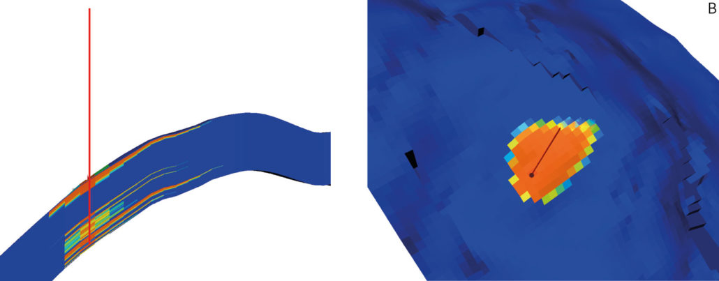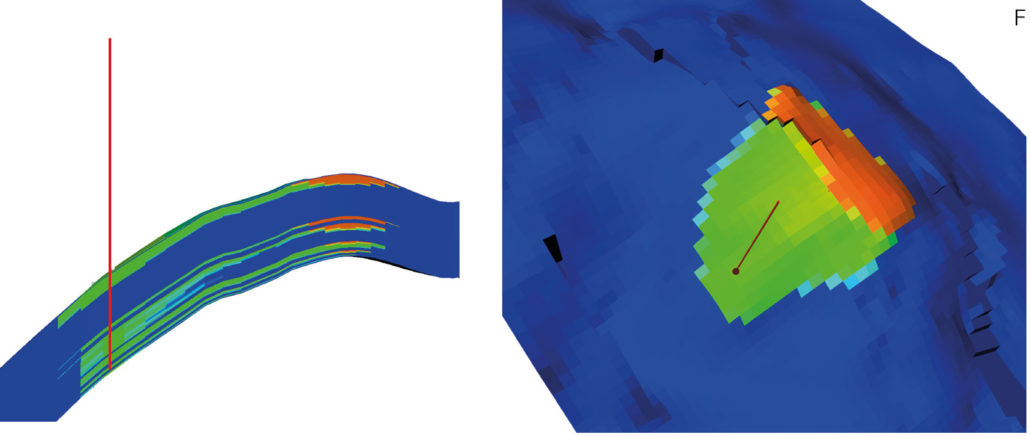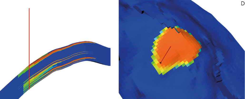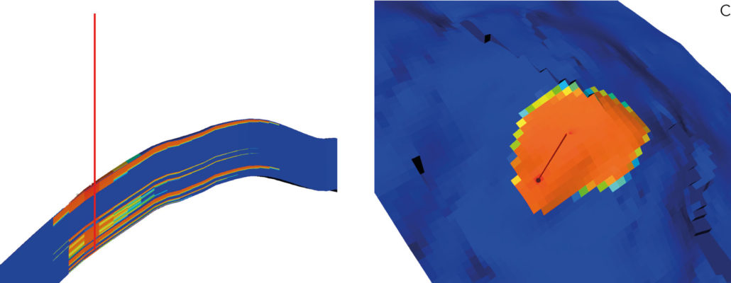 3D-simulering af Vedsted-strukturender viser dens rumlige udformning i undergrunden. Strukturens top ligger 1750 meter under jordoverfladen. Den røde streg viser en virtuel CO2-brønd, hvor CO2‘en pumpes ned (injektionsbrønd).
