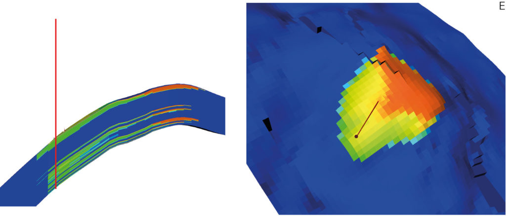 Struktur i profil: Koncentrationen af CO2 i sandstenslagene er nu betydeligt højere i strukturen (rødlige farver). CO2’en stiger opad i reservoiret, da den er lettere end porevandet, og det ses på de aflange røde felter, der bevæger sig mod toppen. Pga. det høje tryk i røret, mases noget af CO2’en også et stykke ned ad bakke i sandstenen, før trykket udlignes.