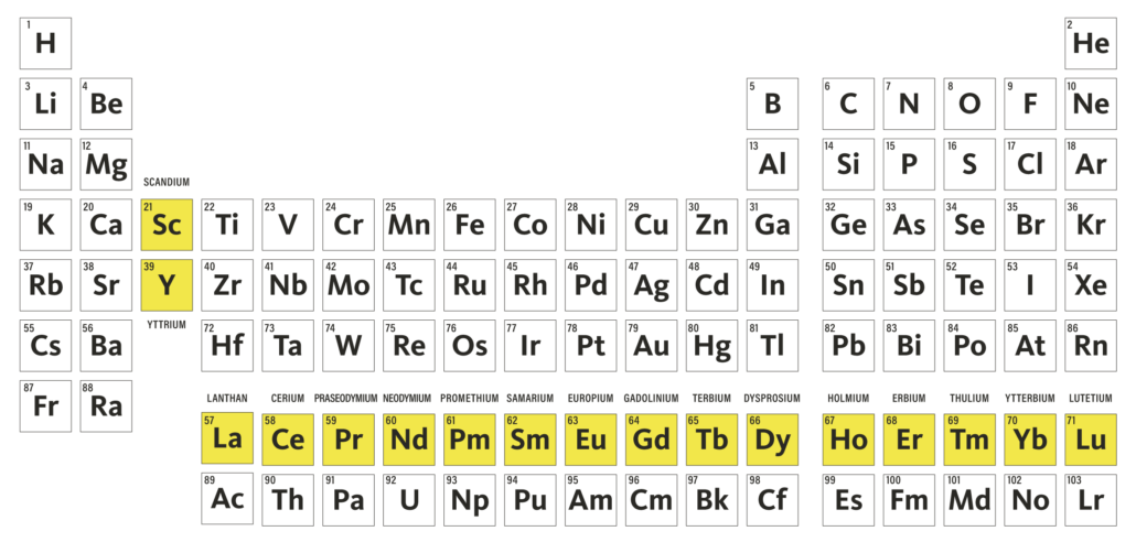 Vidste du, at din telefon er fuld af små magneter? Magneterne er med til at få telefonen til at ringe, vibrere, lade op osv. De fleste elektriske hverdagsting som telefoner og computere indeholder magneter, og derfor er der rift om de metaller, de består af. Især de såkaldte sjældne jordartsmetaller (fremhævet herunder).