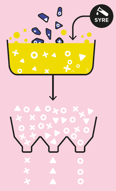 De sjældne jordartsmetaller sidder stadig fast i forskellige mineraler, som opløses med syre. Det slipper de sjældne jordartsmetaller fri, så de alle sammen flyder frit rundt mellem hinanden.