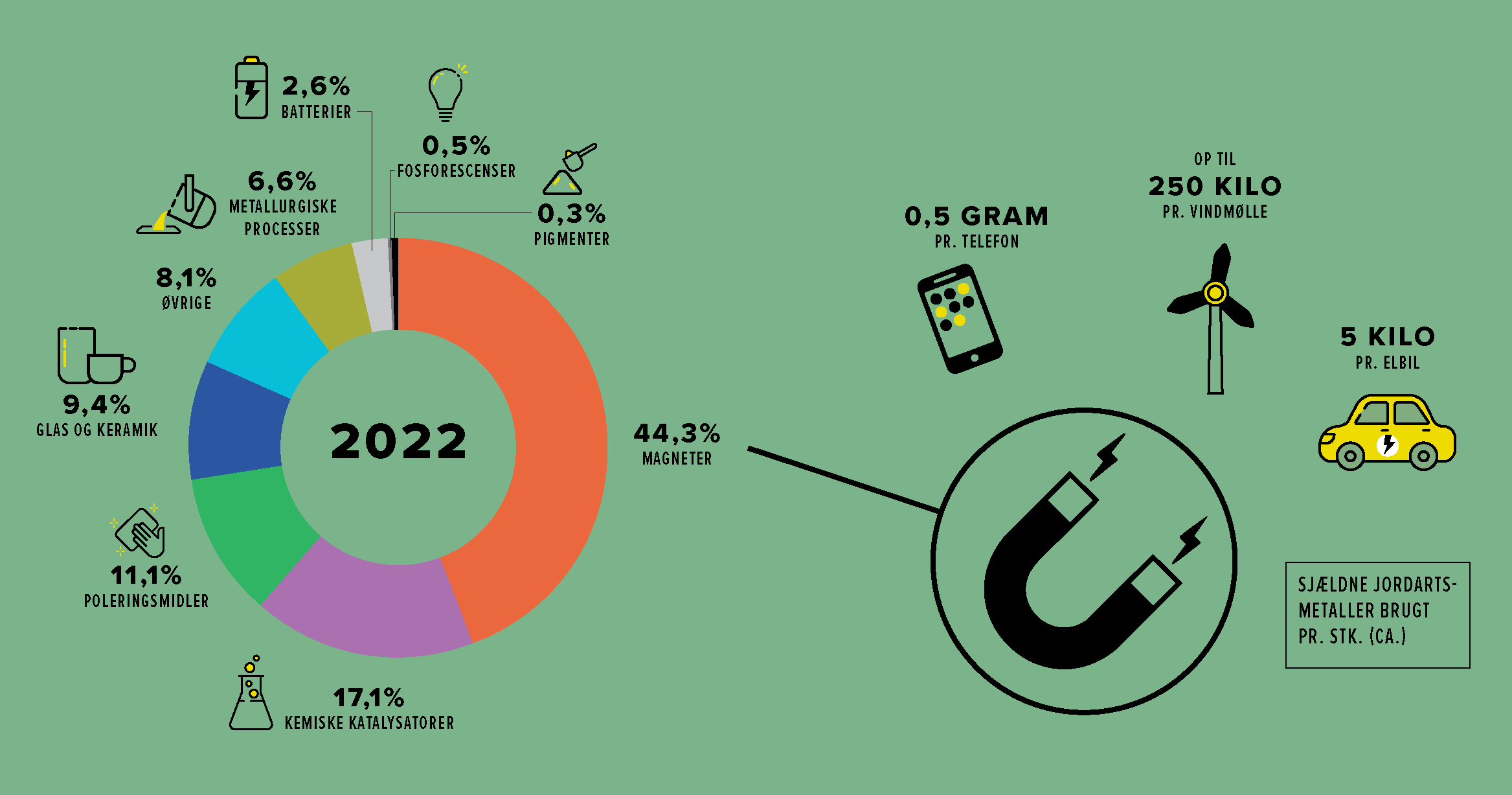 Hvor en enkelt mobiltelefoni gennemsnit bruger ca. et halvt gram sjældne jordartsmetaller i alt, så skal der til de største vindmøller bruges op mod 250 kilo! Det er altså nogle helt andre mængder, det kræver. Produktionen af både vindmøller og elbiler forventes at stige og kræve en endnu større del af de sjældne jordartsmetaller, der udvindes.