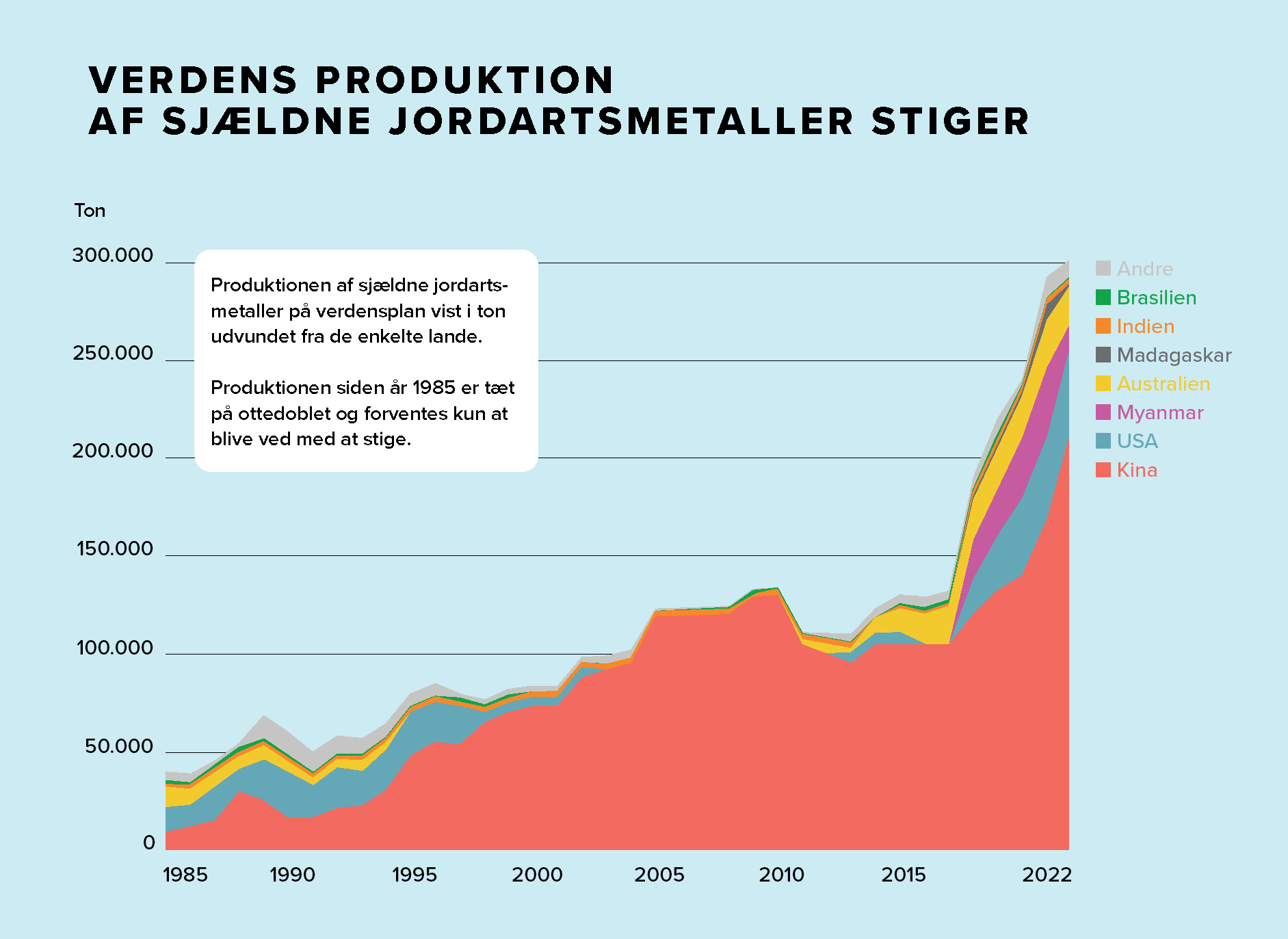 I 2022 blev der på verdensplan udvundet ca. 300.000 ton sjældne jordartsmetaller, og langt størstedelen blev udvundet i Kina. Indtil slut-1990’erne var USA verdens største leverandør af sjældne jordartsmetaller, men så overhalede Kina, som siden har domineret produktionen totalt (se graf nedenfor). USA er nu i gang med at opskalere produktionen. Dog sendes malmen stadig til Kina til behandling, når den er gravet ud.