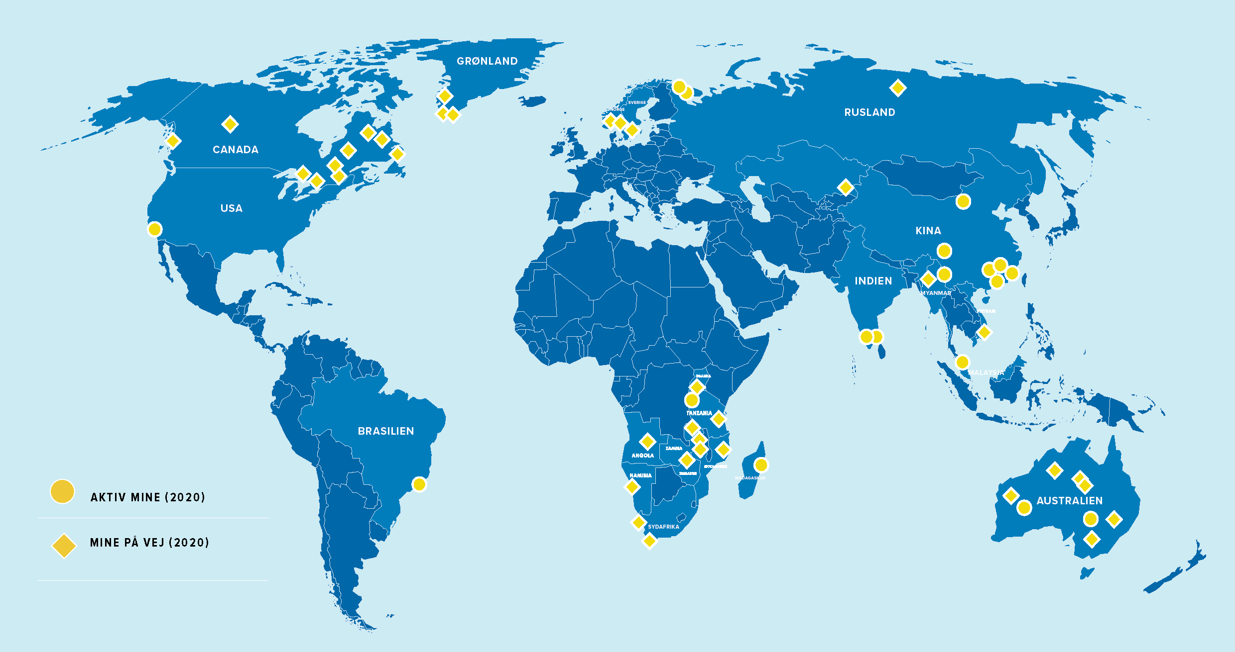 Sjældne jordartsmetaller er faktisk ikke særligt sjældne, de findes i forskellige mineraler verden over, som du kan se på kortet herunder. Typisk i en stor blanding af alle 17, da de ligner hinanden meget og derfor typisk ender i de samme kemiske miljøer i undergrunden. Nogle steder er koncentrationen høj nok til, at det kan betale sig at udvinde dem.