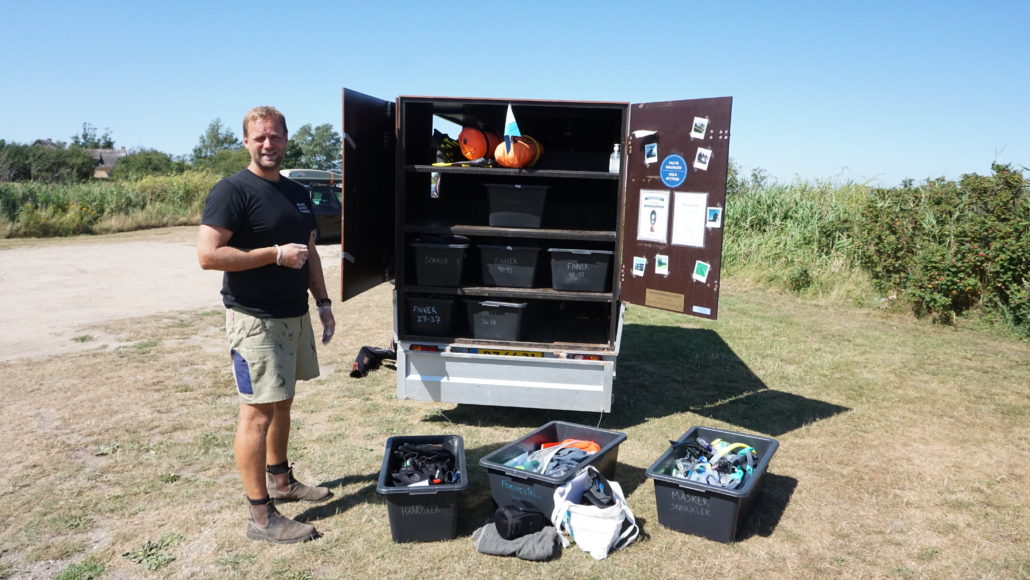 Han åbner traileren og hiver baljer med svømmefødder, snorkler og dykkerhandsker ud og stiller dem på græsset.