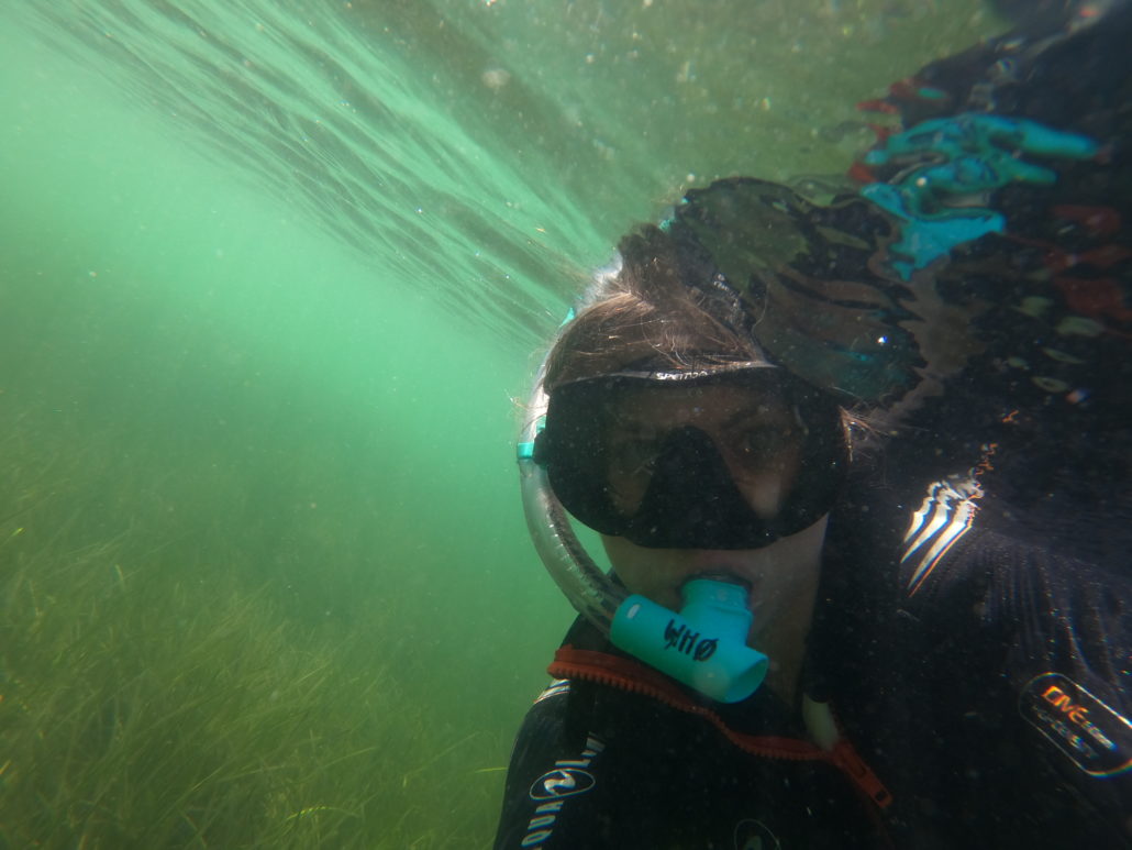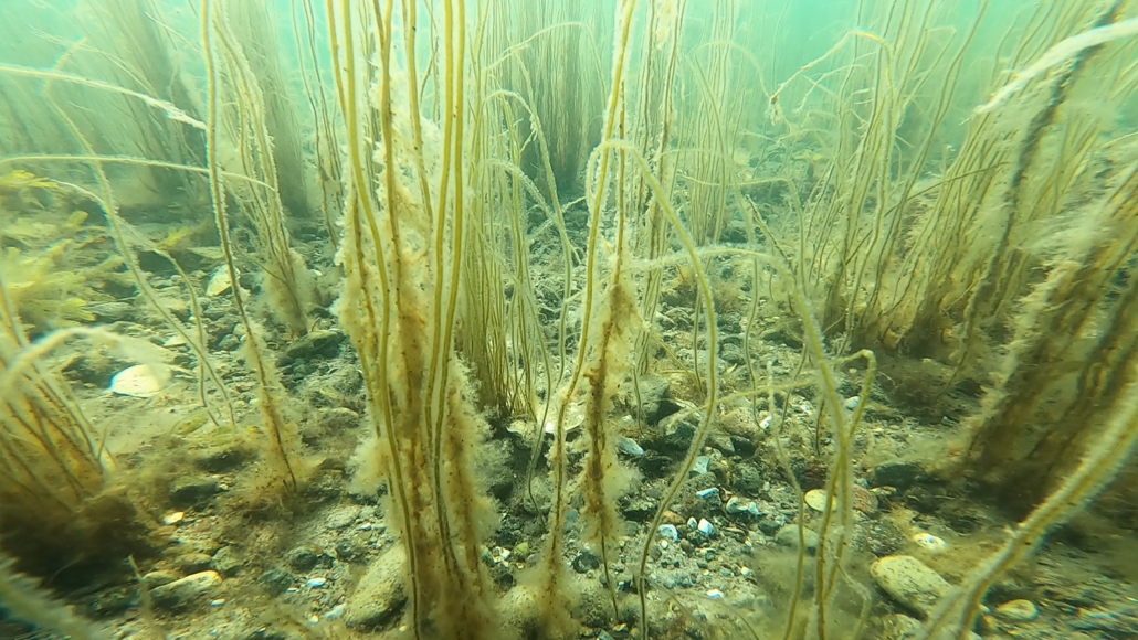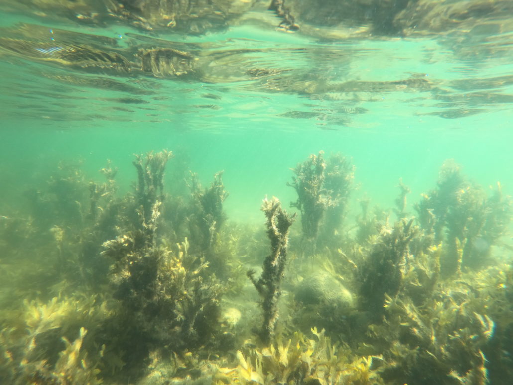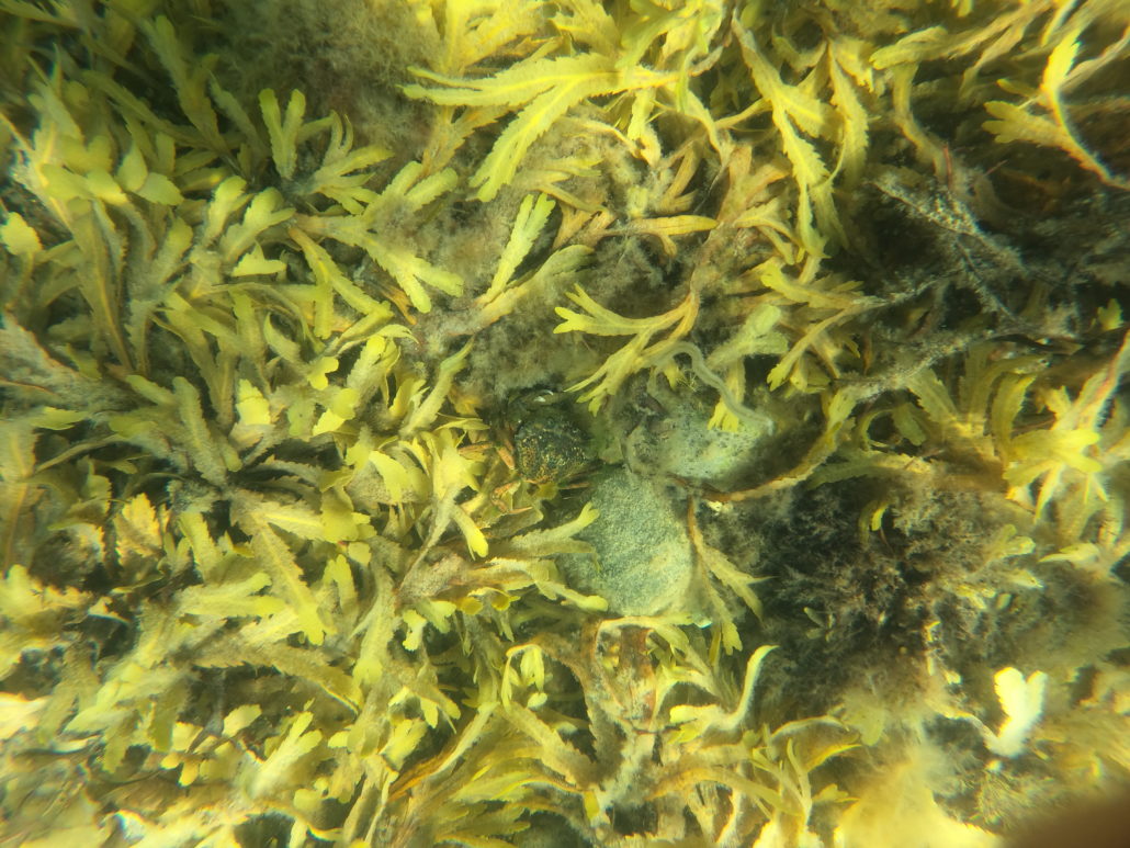 Så det er snuden i vandet og af sted ud langs badebroen. På vejen ud mod stenrevet bliver det dog ikke til mange sten, for jeg er så benovet over myriaderne af liv, der åbenbarer sig under overfladen, at jeg næsten ikke kan koncentrere mig om at kigge efter sten. Krabber, tangnåle, kutlinger og stimer af fiske­yngel myldrer rundt i den tætte tangskov, hvor solens stråler brydes af bølgerne og falder ned gennem det undersøiske løvtag, så skyggerne danser på bunden. De usædvanligt mange forskellige slags tang og ålegræs stråler i alle nuancer af gul, grøn og brun. Når man løfter hovedet oven vande, betages man i lige så høj grad af udsigten 360 grader rundt i bugten, hvor smukt kuperede øer omfavner horisonten.