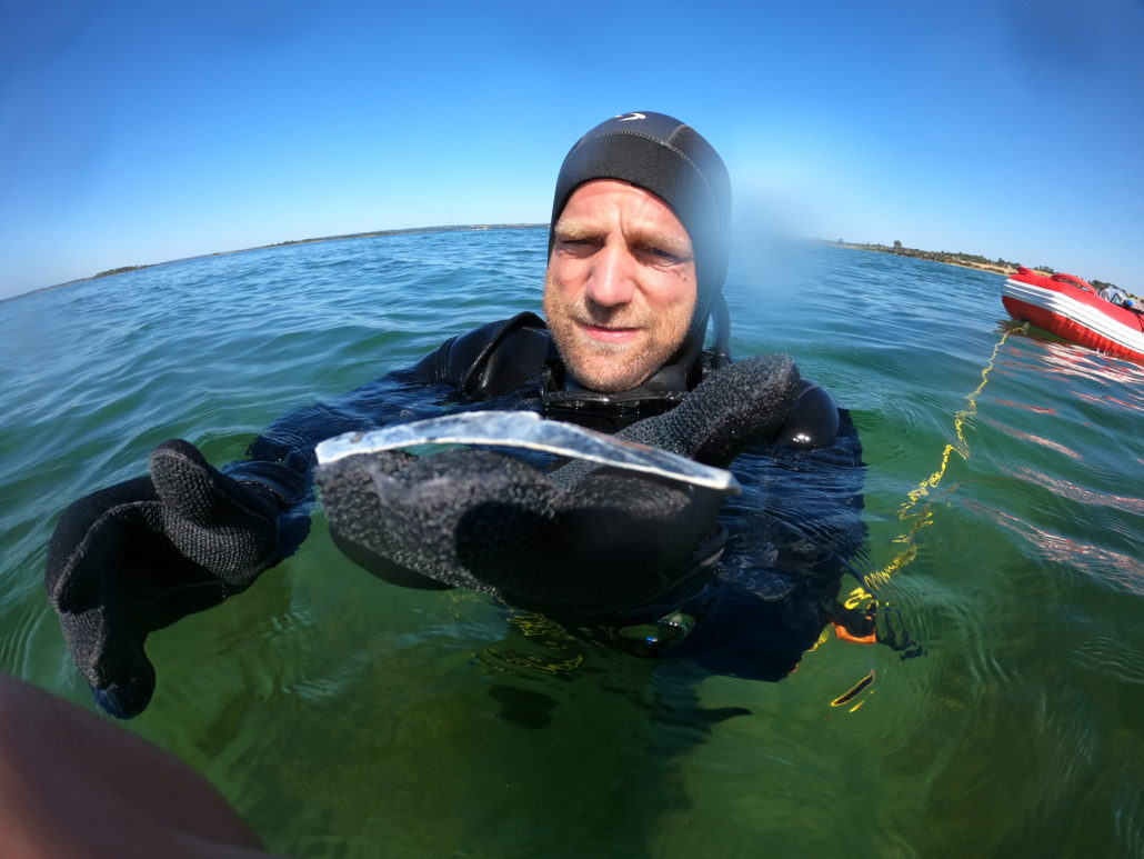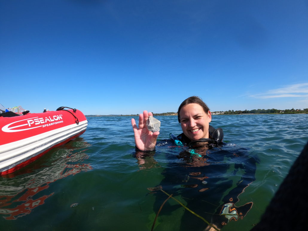 Med teorien på plads kommer våddragterne på (nogle mere elegant end andre). Med svømmefødder, snorkler, dykker­sokker og handsker går vi ad en lille trampesti ned til vandkanten. I den intense middagshede (og efter en lige så intens kamp med våddragten) er det en stor lindring at glide ned i det svale havvand. Poul har dårligt fået ansigtet under vand, før han hiver den første flintegenstand op fra bunden.