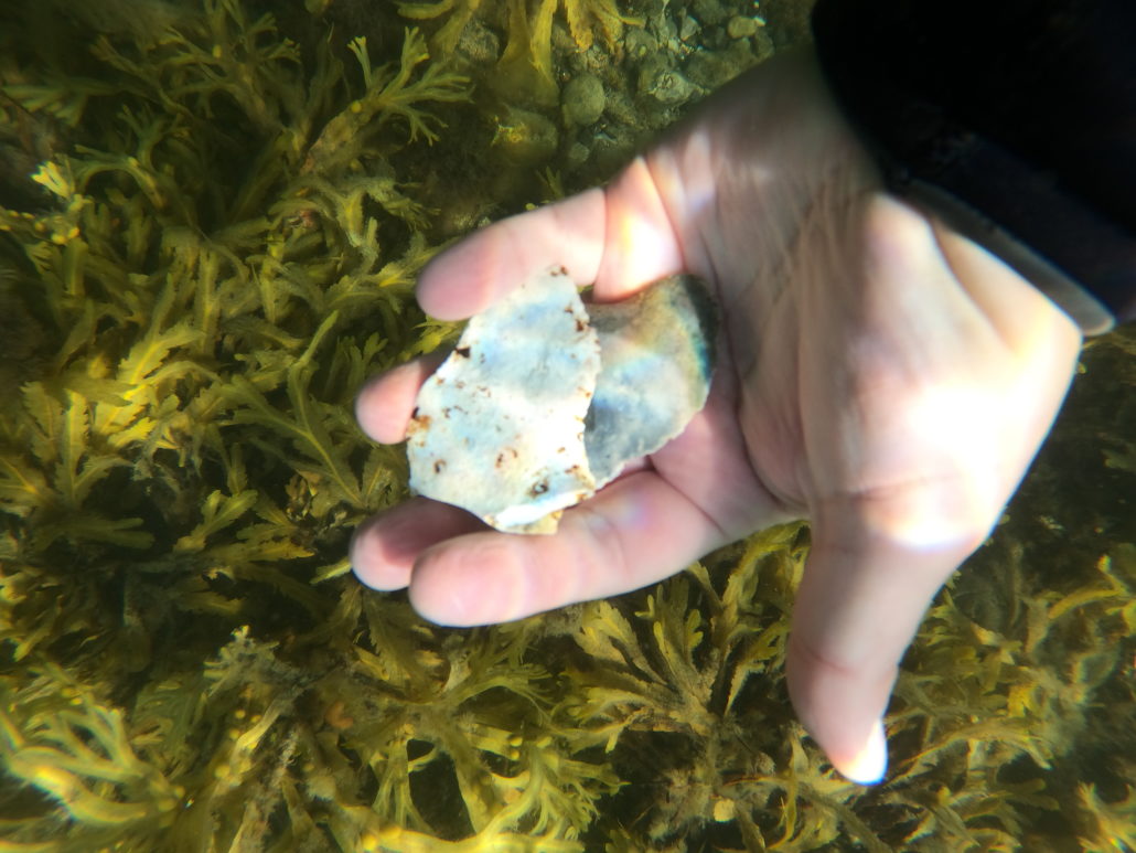 Her går jagten for alvor ind, for nærmest samtlige sten kunne ligne dem fra madkassen. En sten halvanden meter under mig ser særligt interessant ud – den er lys med små pletter af brune alger, men er helt glat på den ene side med en svag bule i toppen, og den anden side har tydelige facetter. Jeg vender bunden i vejet og griber stenen. På vej over mod Poul og den lille gummibåd viser der sig flere kandidater med lignende kendetegn, som jeg samler op.
