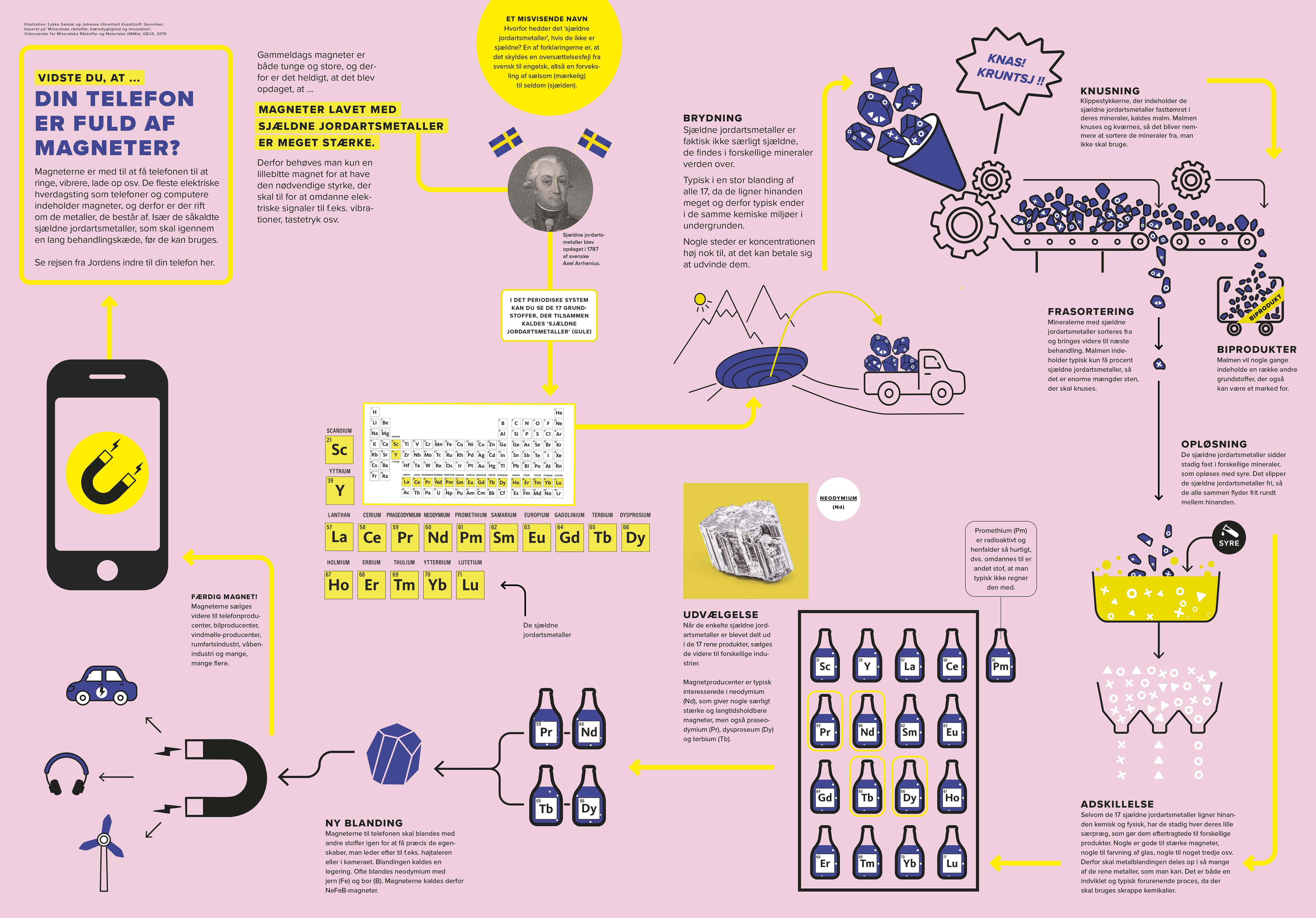 Alt det kan du få svar på i vores nye, opdaterede udgave af en grafisk oversigt, der viser metallernes rejse fra mine til færdig magnet. Du kan se den her på siden eller printe som én stor sammenhængende figur og hænge op i klasselokalet eller hjemme i stuen. Du kan også bare læse, hvad der står på den, i artiklen her.