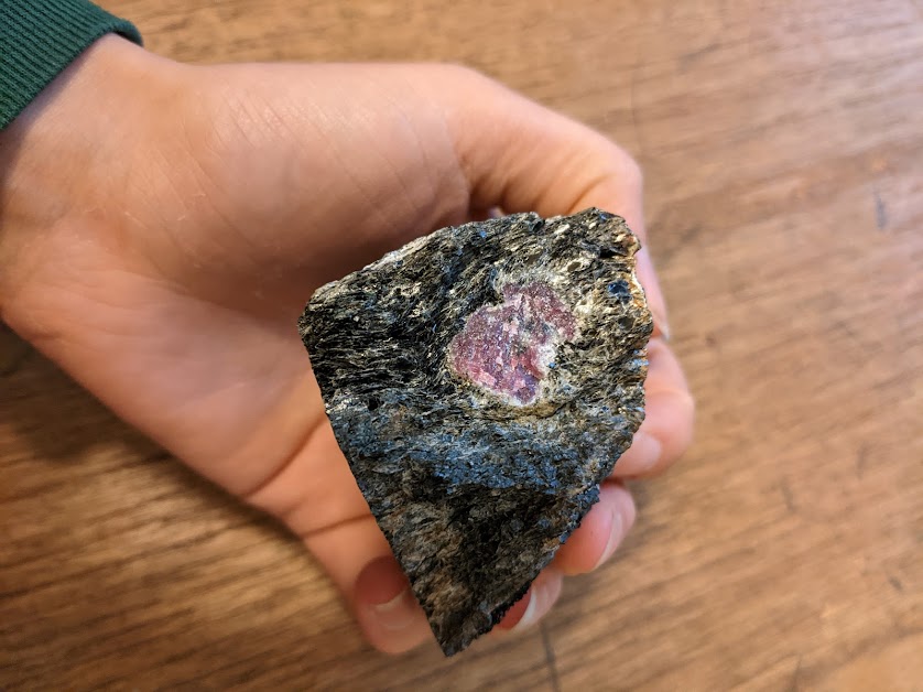 Mineralet olivin er omdrejnings-bjergarten i denne episode, fordi den er stabil i Jordens kappe og kan bindes til CO2. Olivinet er de mørkegrønne krystaller udenom en rød rubin. (Foto: Geoviden)