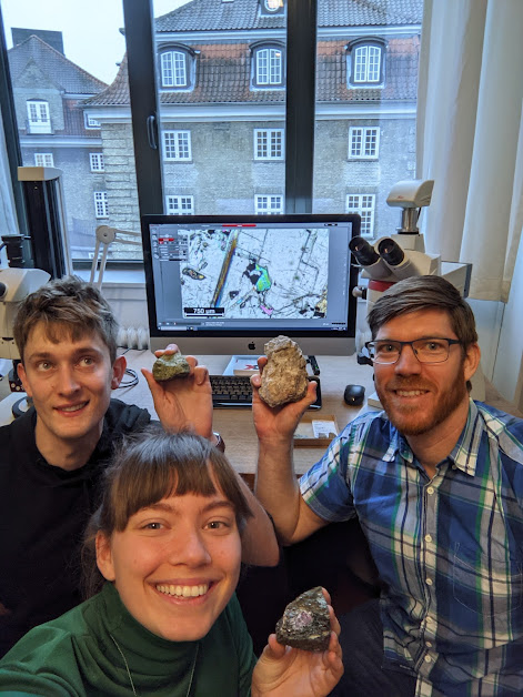 Emil, Mathilde og Kristoffer Szilas med hver sin sten med olivin i foran billede af tyndslib med olivin (Foto: Geoviden)