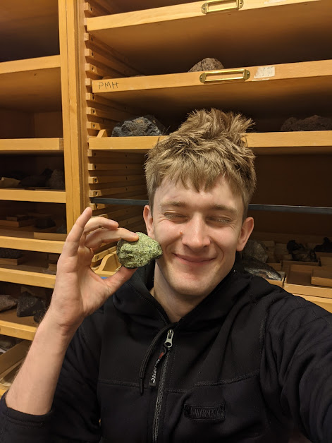 Emil Soltau har olivin som sit yndlingsmineral og ses her med et eksemplar (Foto: Geoviden)