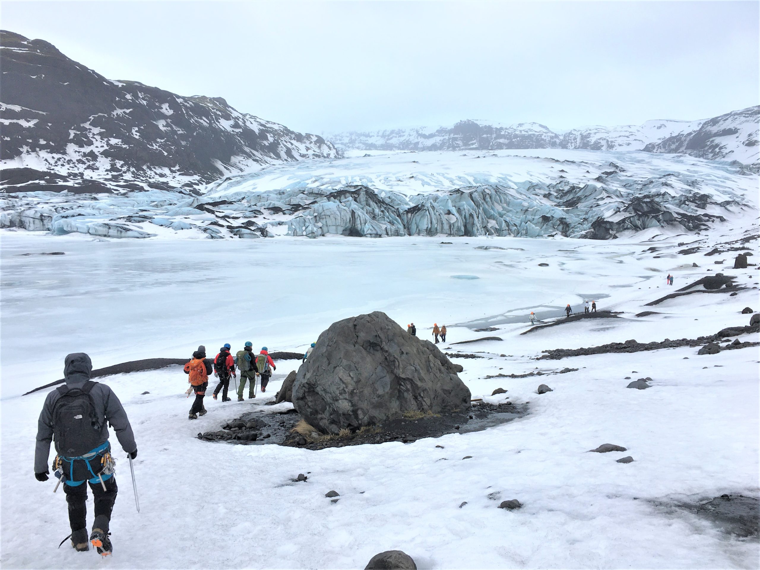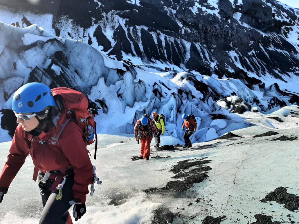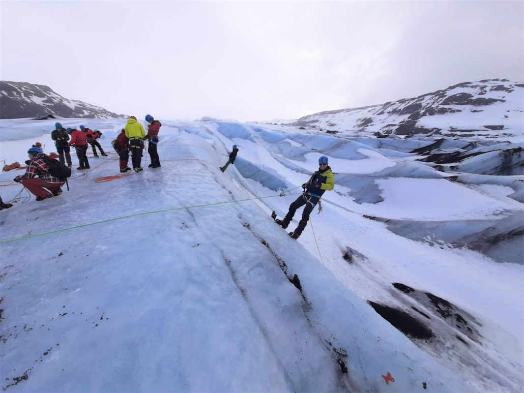Lidt mere end halvdelen af deltagerne har været på kurset ved Sólheimajokull før eller lignende kurser på Svalbard, i Schweiz eller i Canada. Et af de nye ansigter på gletsjeren er GEUS-forsker Signe Hillerup Larsen, som på grund af corona-epidemien har fået udsat sit gletsjerkursus et par år. Hun har dog været på Indlandsisen før og har deltaget i kurser i de nødvendige klatre- og redningsteknikker i Hareskoven nordvest for København. Den del af sikkerhedstræningen, som glaciologerne kalder ’tørtræning’. Hvilket er alle de samme øvelser, bare uden en gletsjer, og som cirka en gang årligt bruges til at holde redningsfærdighederne ved lige. Det er derfor ikke ukendt farvand for hende at være på vej hen mod en mur af is.