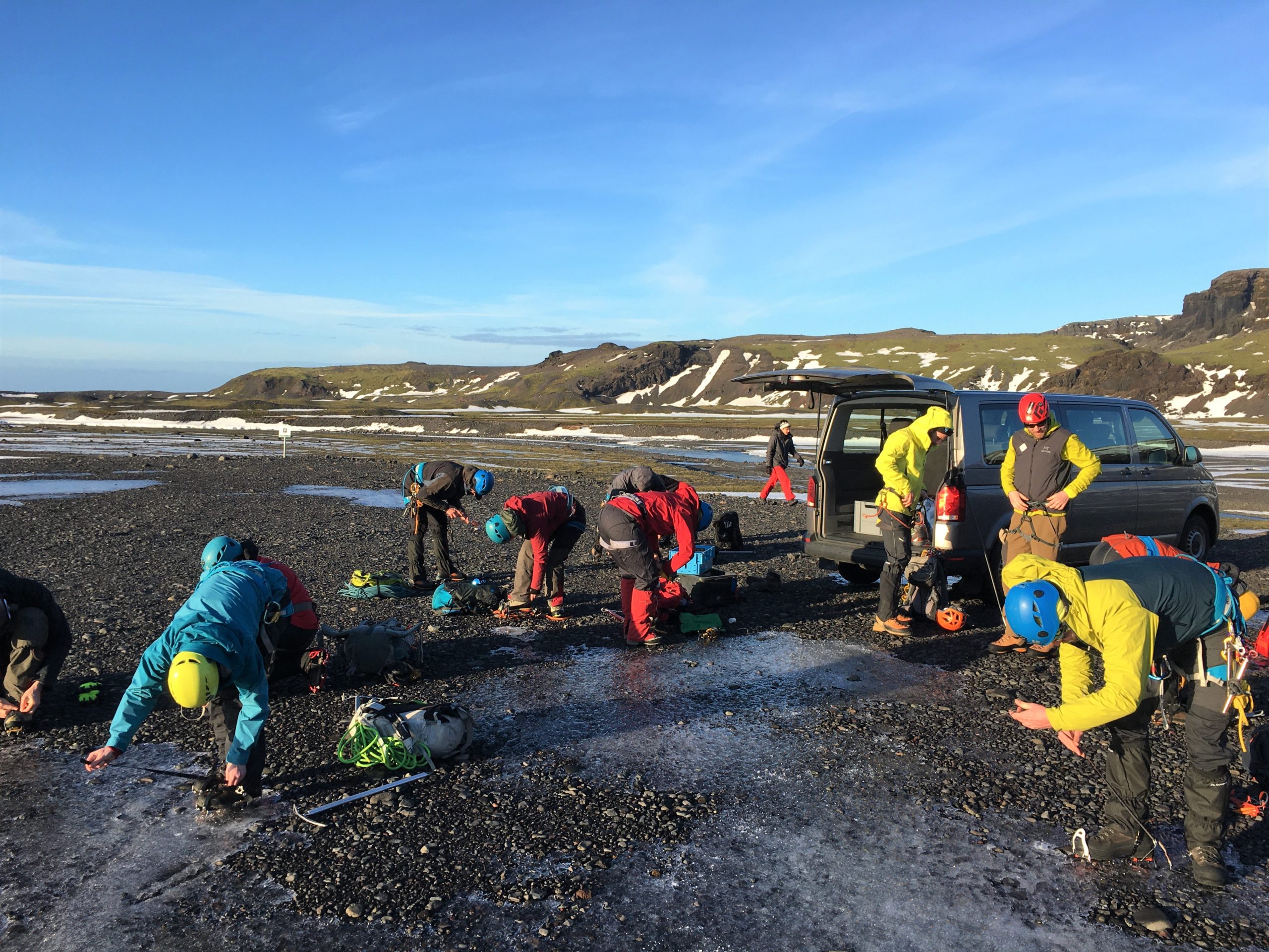 Bagsmækken på minibussen åbnes og murerbaljer fulde af klatreudstyr, klatrejern og isøkser hives ud på sneen. Der sænker sig en koncentreret ro over flokken, imens alle trækker i de sidste vind- og vandtætte lag tøj og begynder at ’geare up’. Klatreseler (’harness’) spændes, forskellige slags karabinhager, snoretræk og trisser klipses i bæltet sammen med reb i forskellige tykkelser og længder samt et sæt lange skruer. Hjelm på hovedet, isøkse i hånden.