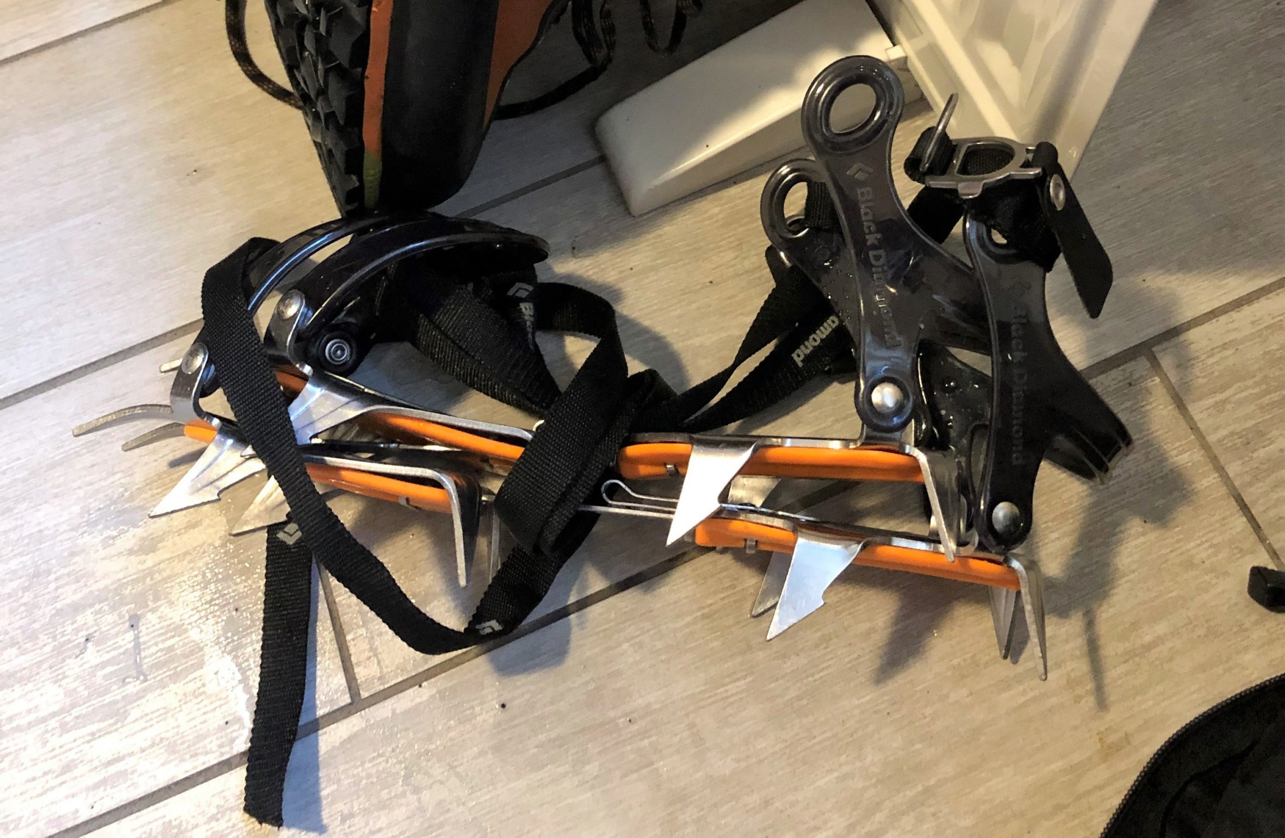 De ligger i en bunke og ligner rekvisitter fra en dødsmetal-musikvideo. Flere er lidt usikre omkring påførelsesprocessen, så guide nummer to, Mike Reid, hjælper. Først justeres de i størrelsen, og så bindes de fast på støvlen med lange nylonbånd rundt og rundt som en slags aggressiv balletsko.