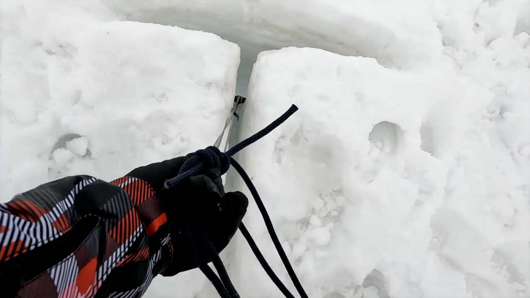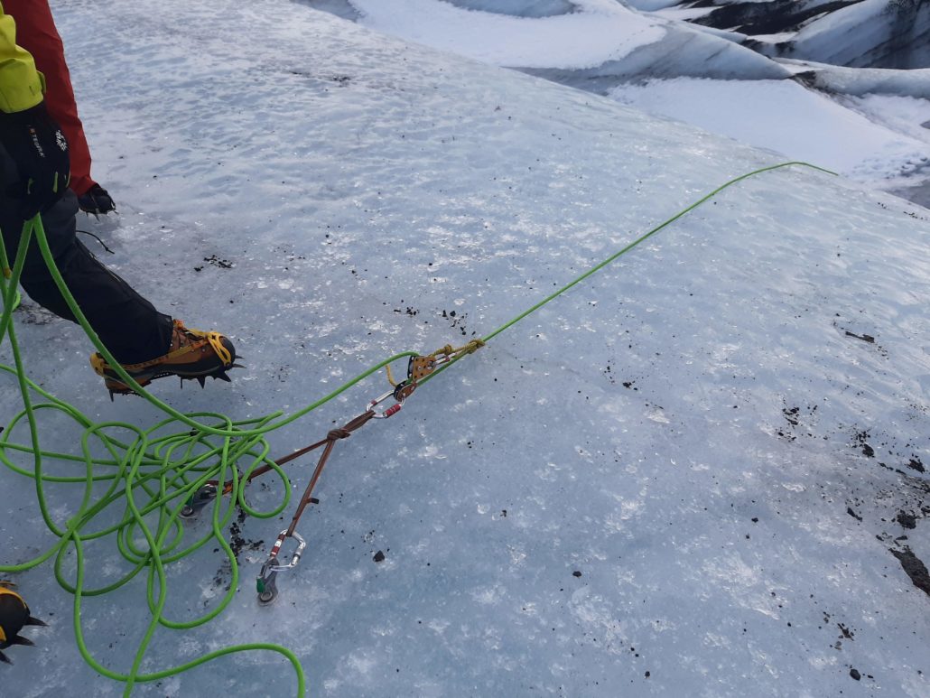 Fordybningen er dog ikke vores ven. Den skal nu agere fjendtlig gletsjerspalte i næste punkt på dagsordenen. Nemlig at kunne rede sig selv eller andre/andet op herfra. Her kommer de to lange skruer, vi har med i bæltet, ind i billedet. De skal skrues ned i isen ca. 30 cm fra hinanden og have en af remmene hægtet fast med en knude og en karabin pegende mod iskanten.