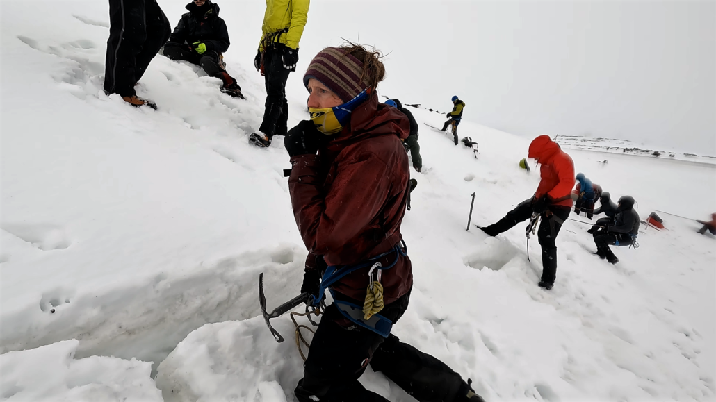 ”This is more like it, huh?” udbryder Mike Reid. Hvilket normalt ville være irriterende, men flere på holdet hujer og griner, da vi i tremands-rebhold går længere op ad gletsjeren. Mere og mere udsat for vejrets rasen.