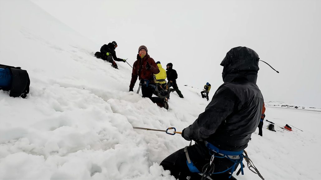 Langs bakkekammen befinder sig ni glaciologer, teknikere og medhjælpere fra De Nationale Geologiske Undersøgelser for Danmark og Grønland (GEUS) plus tre samarbejdspartnere fra hollandske Utrecht University. Alle i fuld gang med forskellige stadier af gletsjersikkerhedsøvelsen, hvor det gælder om at standse sit fald og derefter hale sin faldne makker op igen. Hvis man da når så langt og ikke begge falder ud over ‘gletsjerkanten’, som i dag spilles af en snedækket skråning i Sydisland, fordi vejret på den tiltænkte trænings-gletsjer var for dårligt.