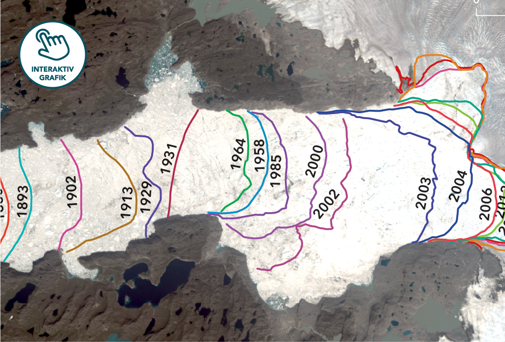 Ved hjælp af moderne satellitovervågning kombineret med gamle kort og observationer af frontens position tilbage fra 1850’erne kan man se, at Sermeq Kujalleq siden da er begyndt at miste mere is, end der blev tilført inde fra oplandet. Det har resulteret i, at gletsjerfronten i dag ligger over 40 kilometer længere tilbage, end den gjorde dengang (se kort herunder med gletsjerfrontens position i slutningen af smeltesæsonen i de fremhævede år). En tilbagetrækning, der er gået så hurtigt, at den kun kan tilskrives menneskeskabte klimaforandringer.