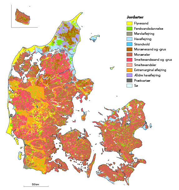 Her kan man se, at overfladen i det østlige Danmark er domineret af moræneler, som er den jordart, der aflejres under gletsjere, og som er en blanding af sand, grus, ler og sten. Vestjyllands overflade består derimod næsten udelukkende af smeltevandssedimenter i form af sand og grus.