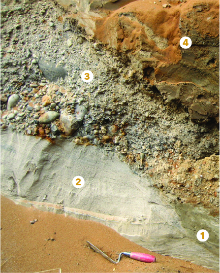 - Øverst ses igen et lerlag med indslag af fint sand, der er rødt på grund af udfældning af oxideret jern eller rust. Lav permeabilitet. (Helt nederst tv. ligger løst sand og grus.) (Foto: Stig Schack, GEUS